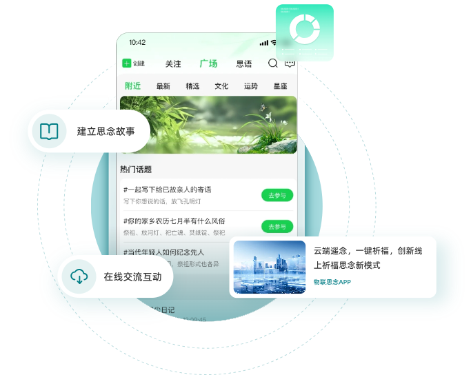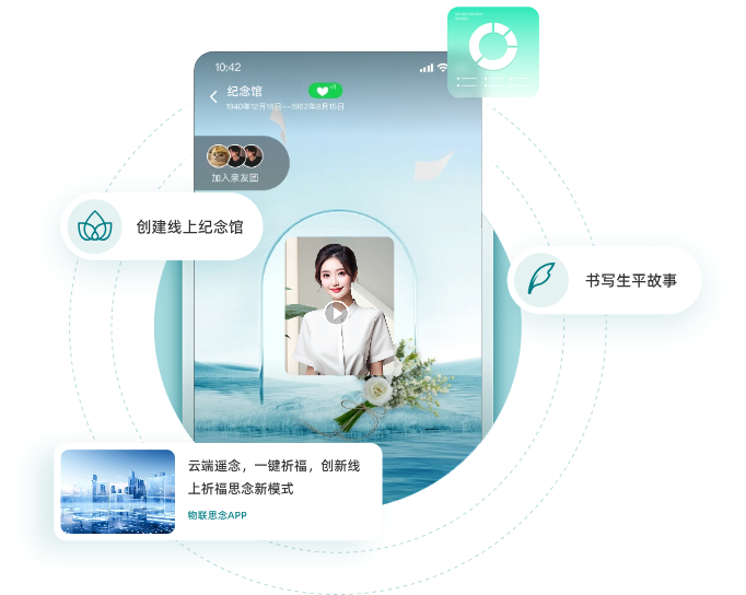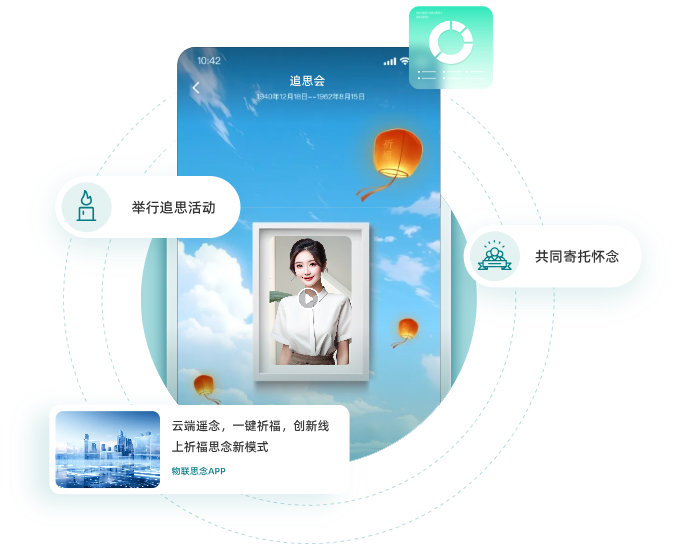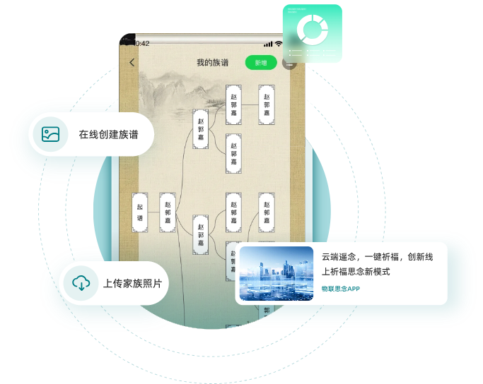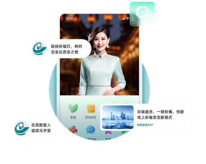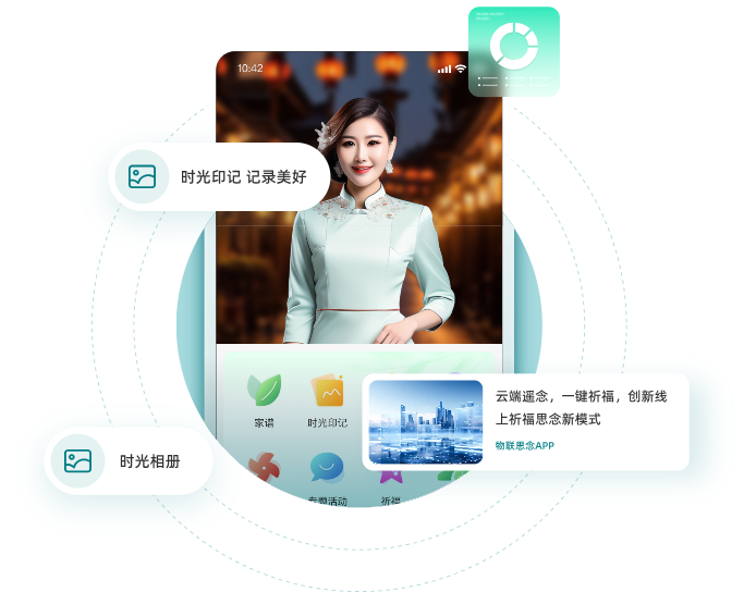 物联思念APP是一个手机端应用小程序软件。在物联思念APP,用户可以为亲友建立纪念馆,撰写生平事迹,进行互联网思念。APP通过互联网链接祈福灯,跨越时空表达祝福和思念之情。在APP界面,可以和灯影数智人对话,进入元宇宙世界遨游。物联思念APP还提供了家族家谱功能,作为家族沟通交流的平台。通过家谱链接家族人脉,传播家族文化。